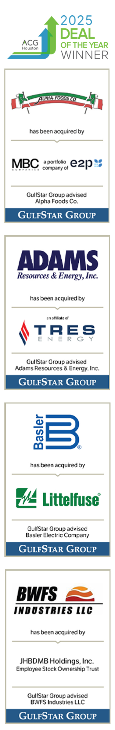 “We are truly honored to be recognized by ACG Houston and our industry peers across multiple award categories,” said Colt Luedde, managing director of GulfStar. “These transactions, spanning the consumer, energy and industrial sectors, reflect the strength of our clients and continued momentum across the middle market. We would like to congratulate our clients on this recognition and acknowledge their significant impact on the Greater Houston area. We also want to thank our fellow deal participants whose collaboration helped drive the success of these transactions.”